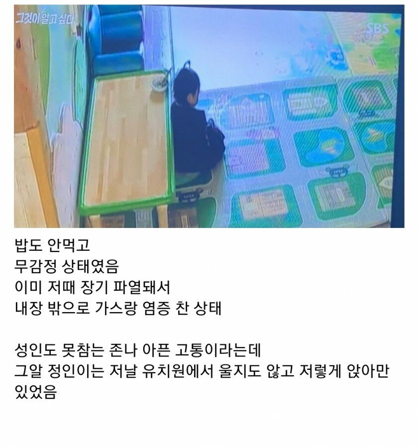 말했다간 더 아픈일 당할까봐... 그리고 어쩌면 자기 몸이 이상한거 알면서 그냥 놓아버렸는지도 모르겠다... 진짜 사람새끼만도 못한 부모 이런나라말고 아오지 이런데 보내야돼...