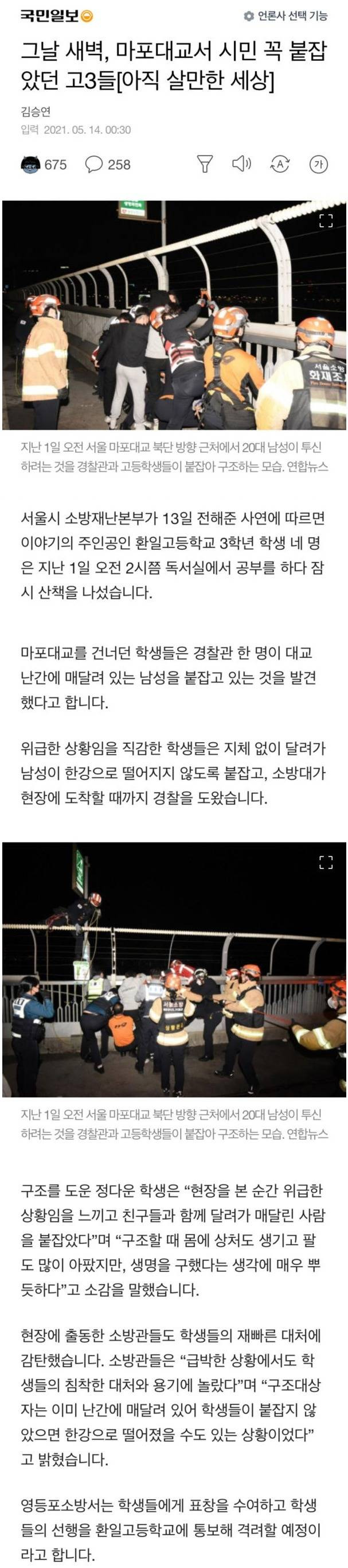 [유머] 마포대교서 시민 꼭 붙잡았던 고3들