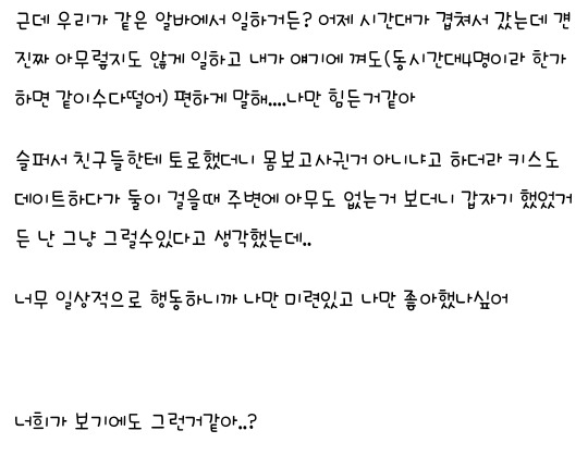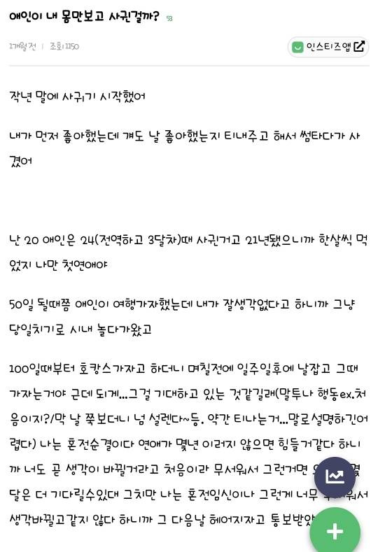 혼전순결 뭐 그럴 수 있지 결혼을 빨리 하고 싶은 상태의 연애상대면 뭐.. 근데 남이 보기에 연애는 하고픈데 결혼은 하기 싫은대 그런 소리 하면 순수하게 보일까 헤프게 보일까 어장관리로 보일가? 힘들어 하면 안되지 그냥 서로 안맞은거라고 생각해야지 뭐 혼전순결도 지키고 싶고 그 사람아니면 안되겟으면 결혼을 이야기햇겟지 혼전순결 이 지랄햇겟니