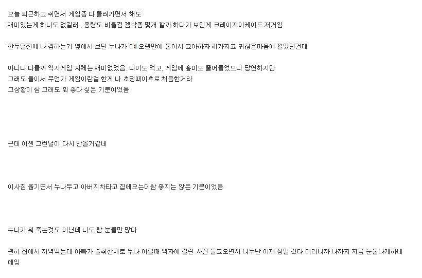 서로 투닥거려도 엄청 사이가 좋았나보네. 우리집도 삼형제인데 한명 기숙사가고 한명 자립하니까 집이 조용해져서 뭔가 낯설었었는데.