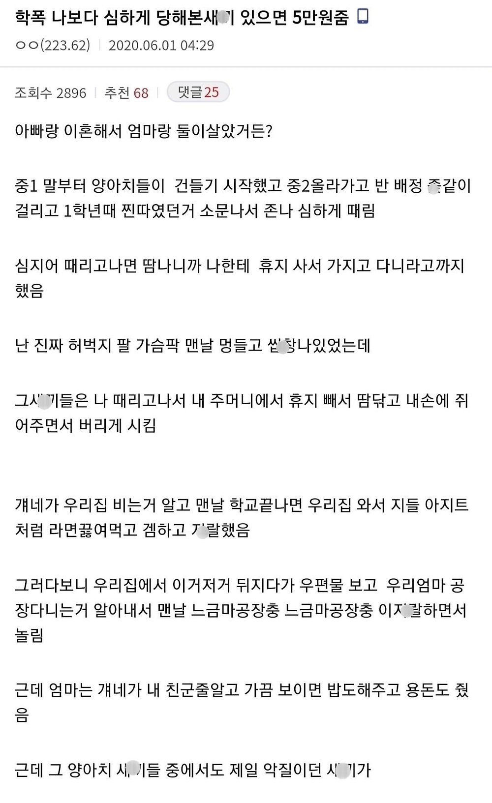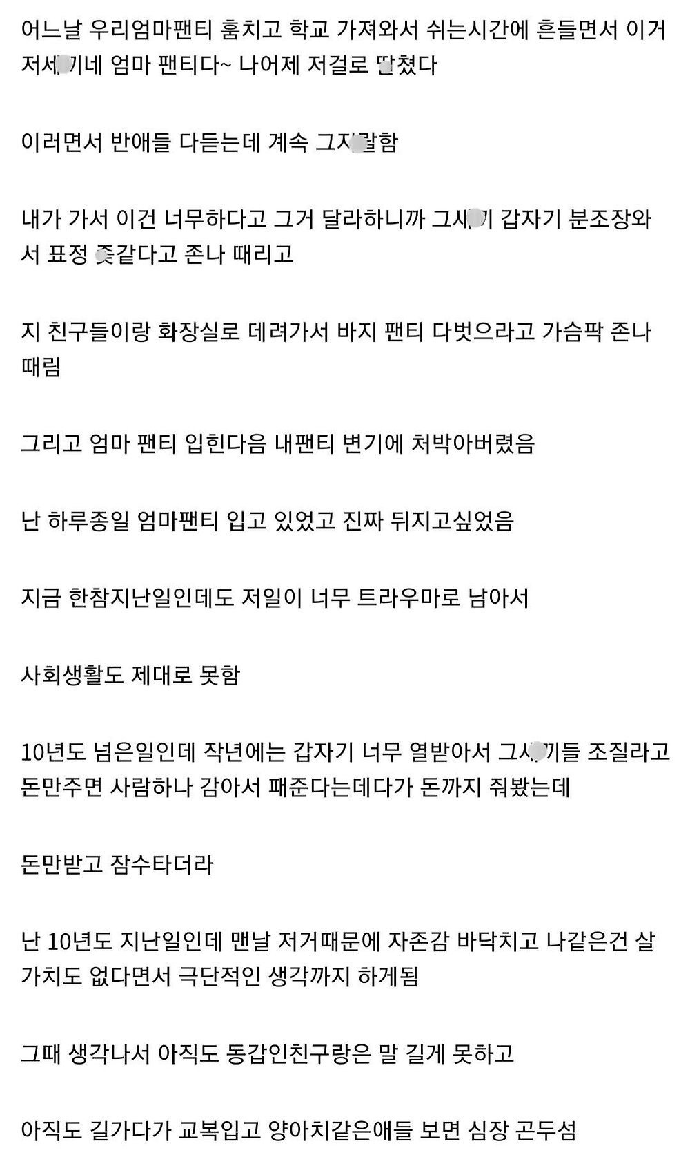 학교폭력... 저도 중학생 때 당했지만 사실 제일 열받는건 그걸 바라보는 방관자들, 보호자들의 태도입니다. 선생님은 특정 제자만 편애할 수 없다고 거리 벌리거나 아예 무관심으로 일관하고, 가해자 측 부모는 맞는 피해자도 문제있는거라고 어머니한테 면박주고... 어머니는 공직자셔서 좋게좋게 가해자들 타이르려고 하고 선생님들한테 잘 부탁드린다고까지 얘기해도 소용이 없었습니다.
