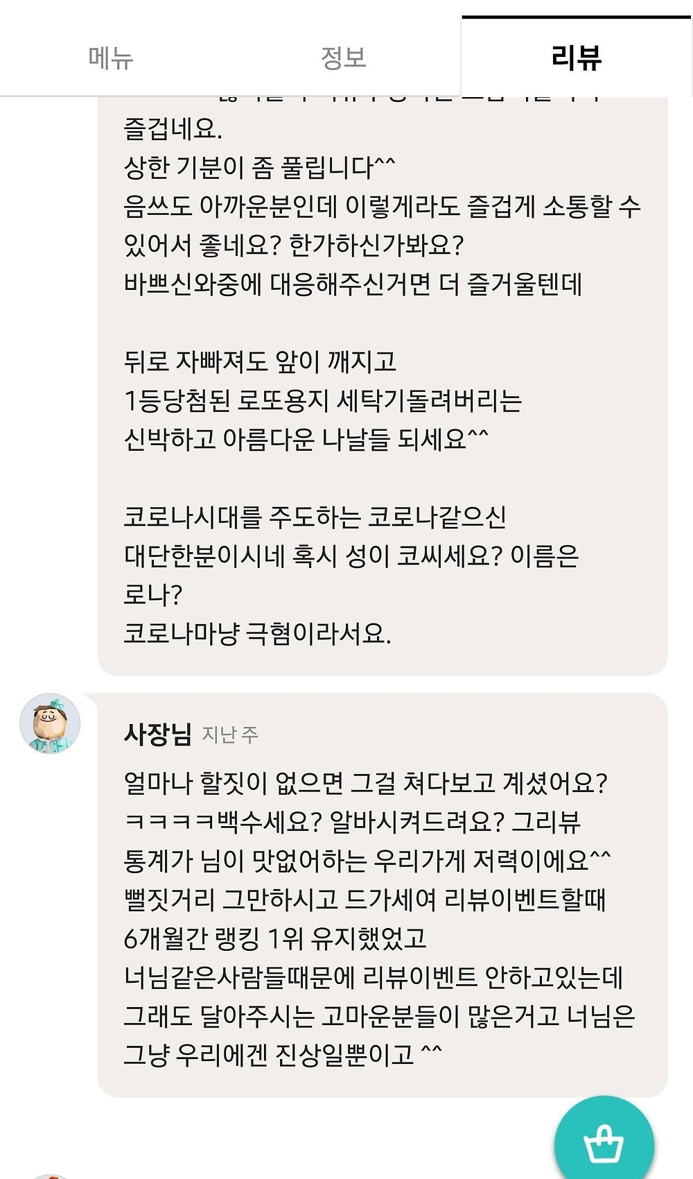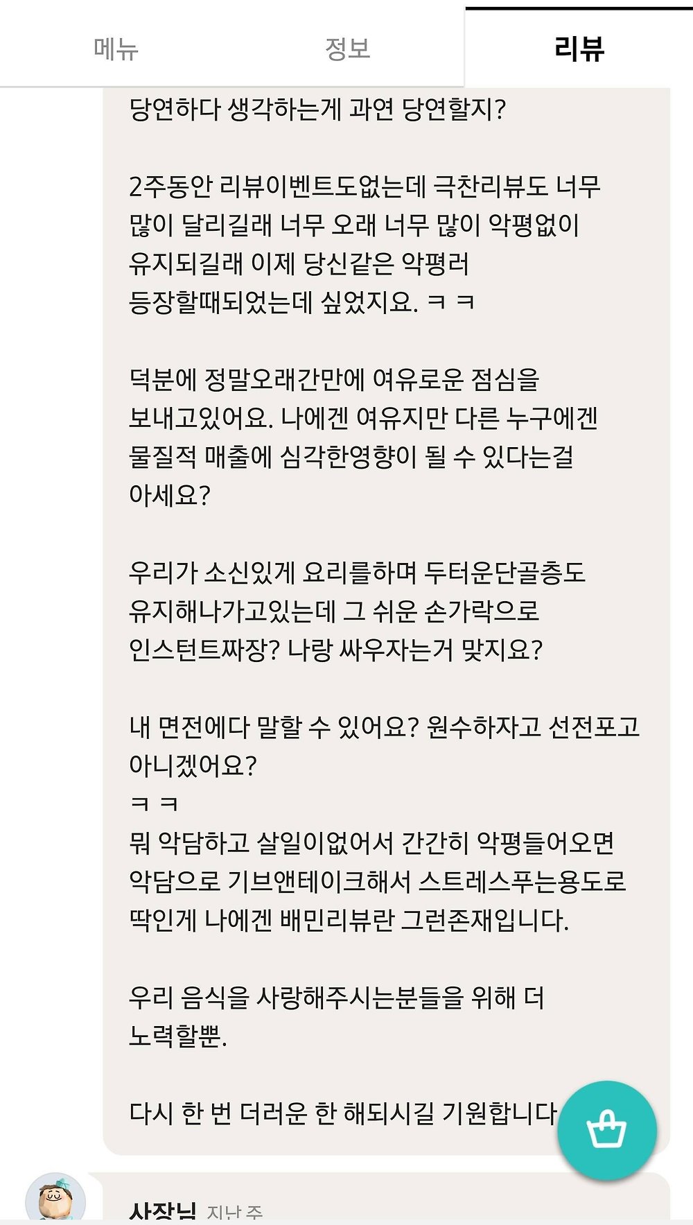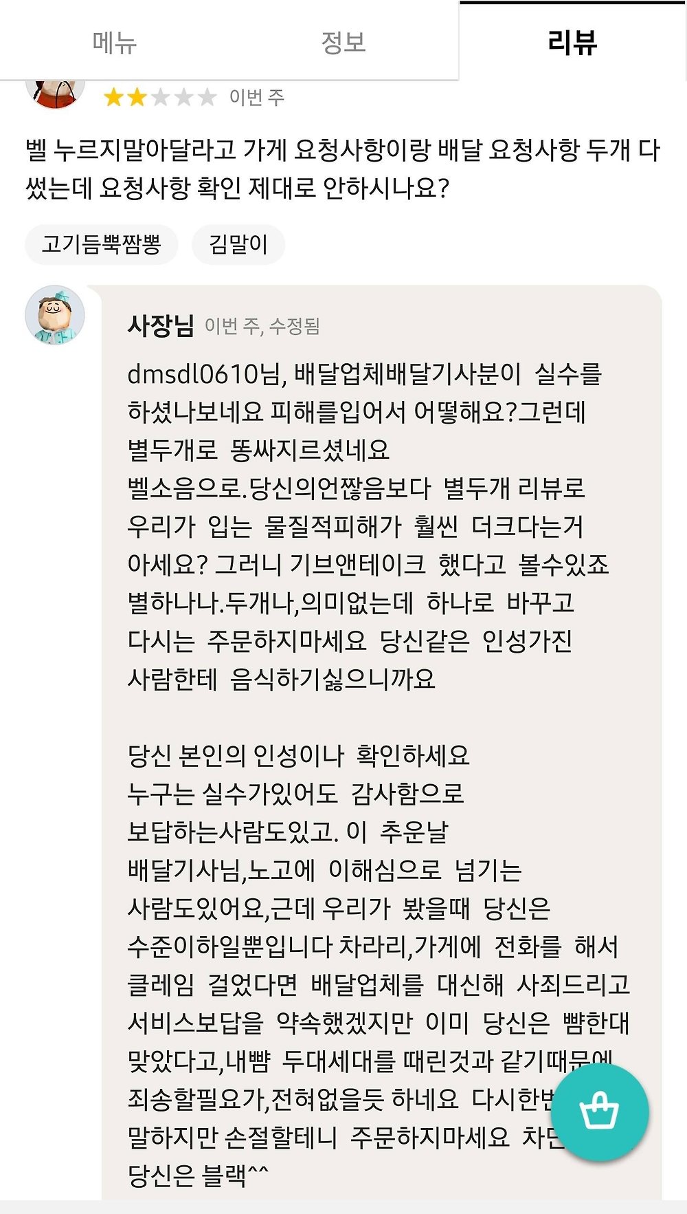 시발 나도 성질 같아서는 저렇게 지르고 싶다 진짜ㅋㅋㅋ 저러는게 잘했다는건 아닌데 리뷰 진짜 존나 스트레스임 개씹쌔끼들 지들 유리한대로만 구라치는 경우도 있고 전화로 다 얘기해놓고 리뷰로 통수치는 경우도 있고 암튼 업주 입장에서는 존나 불리한 시스템임 업주도 댓글달때 사진첨부 가능하면 좋겠다 좆같은 요청사항 같은거는 리뷰 달면 사진 박제해서 조지고 싶음 ㄹㅇ