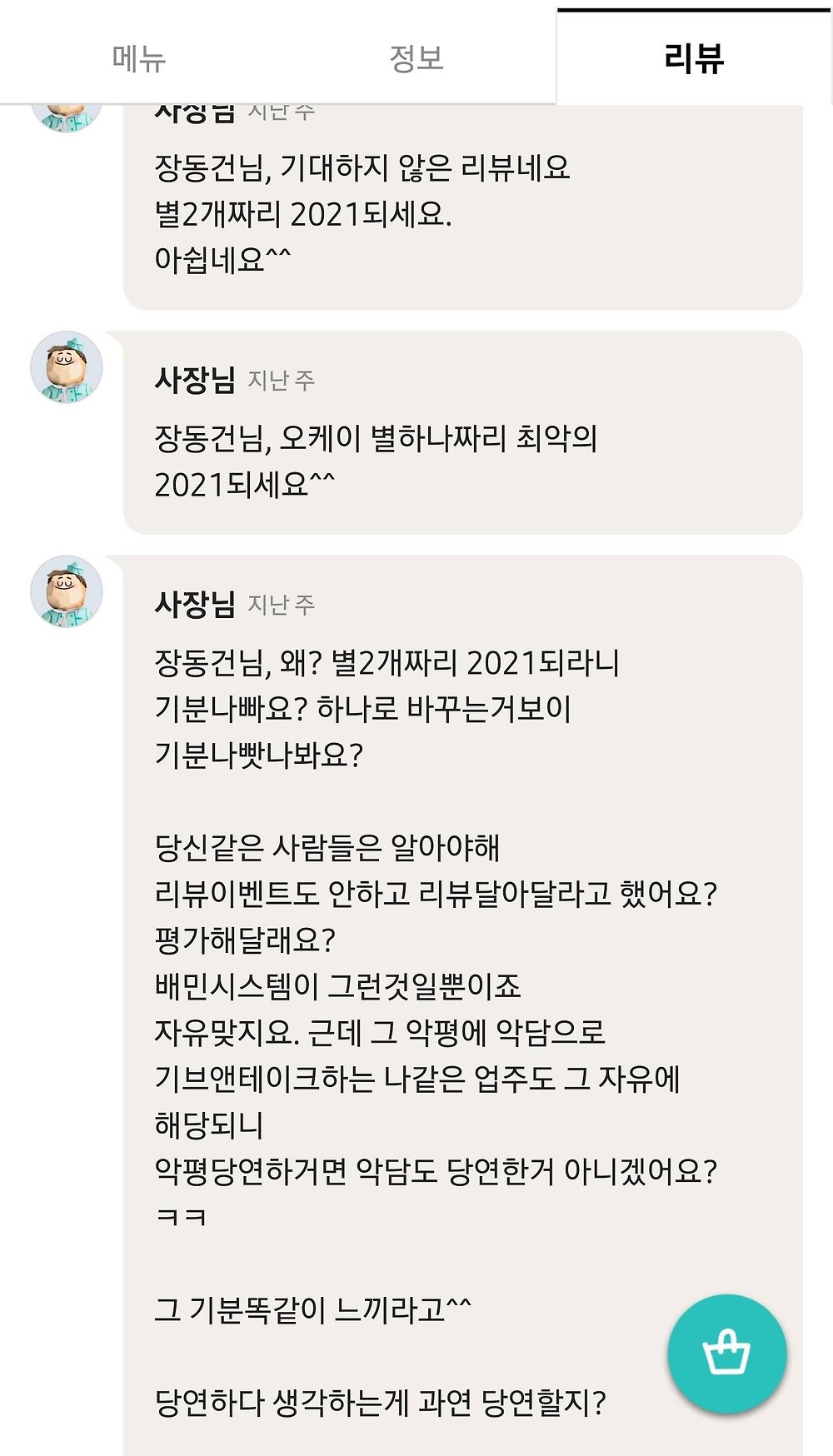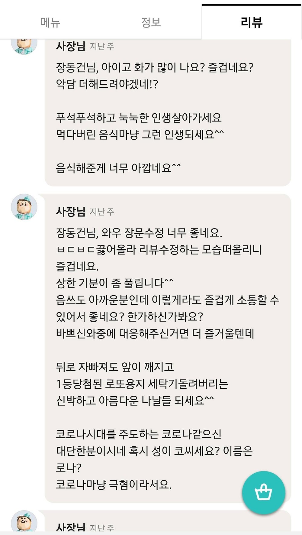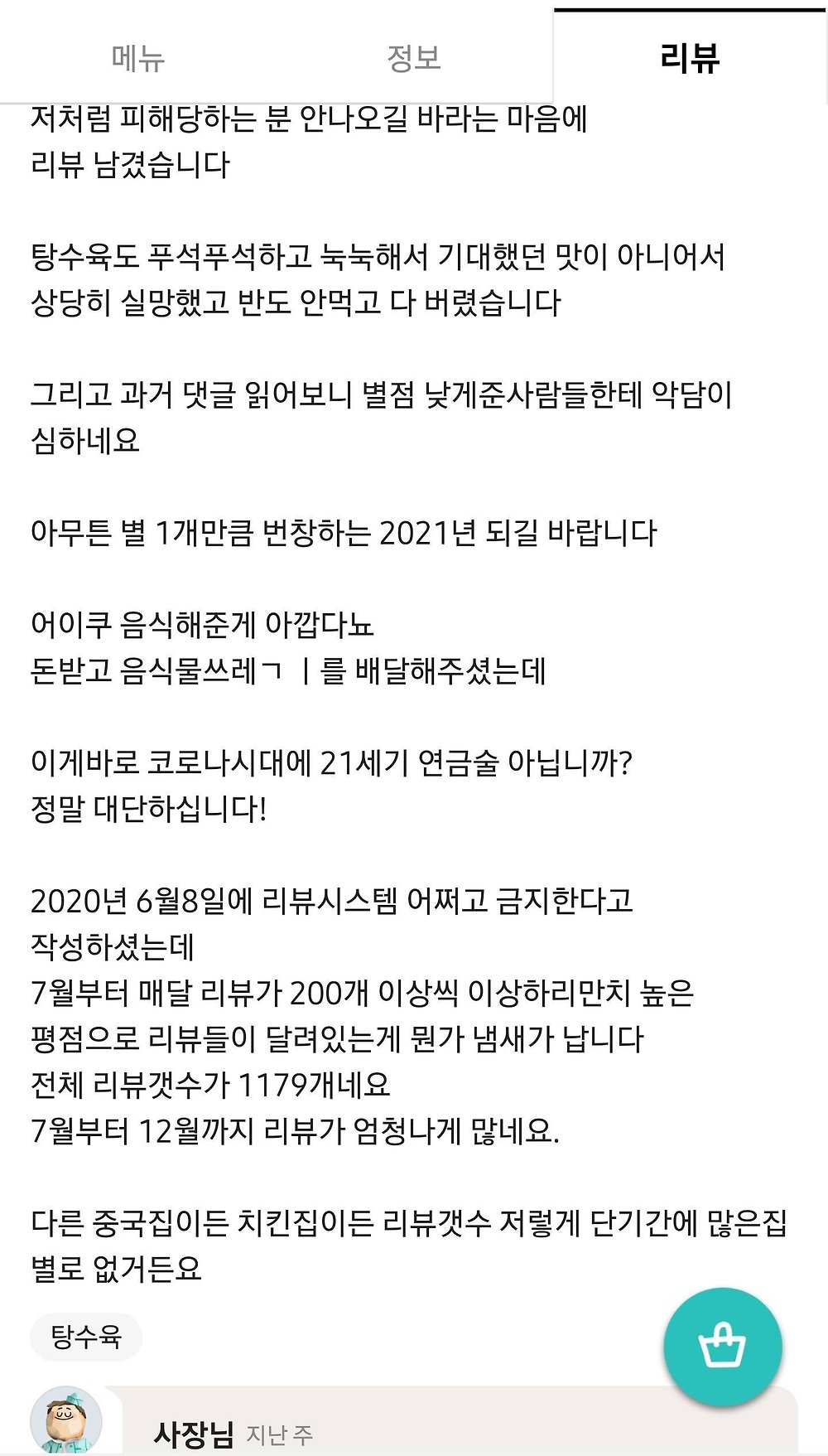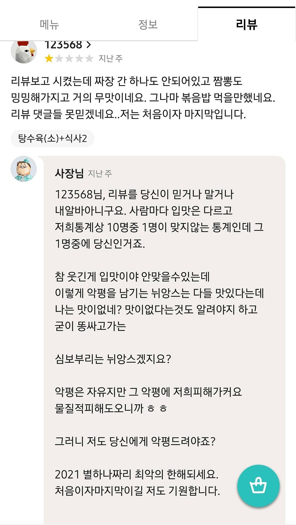 시발 나도 성질 같아서는 저렇게 지르고 싶다 진짜ㅋㅋㅋ 저러는게 잘했다는건 아닌데 리뷰 진짜 존나 스트레스임 개씹쌔끼들 지들 유리한대로만 구라치는 경우도 있고 전화로 다 얘기해놓고 리뷰로 통수치는 경우도 있고 암튼 업주 입장에서는 존나 불리한 시스템임 업주도 댓글달때 사진첨부 가능하면 좋겠다 좆같은 요청사항 같은거는 리뷰 달면 사진 박제해서 조지고 싶음 ㄹㅇ