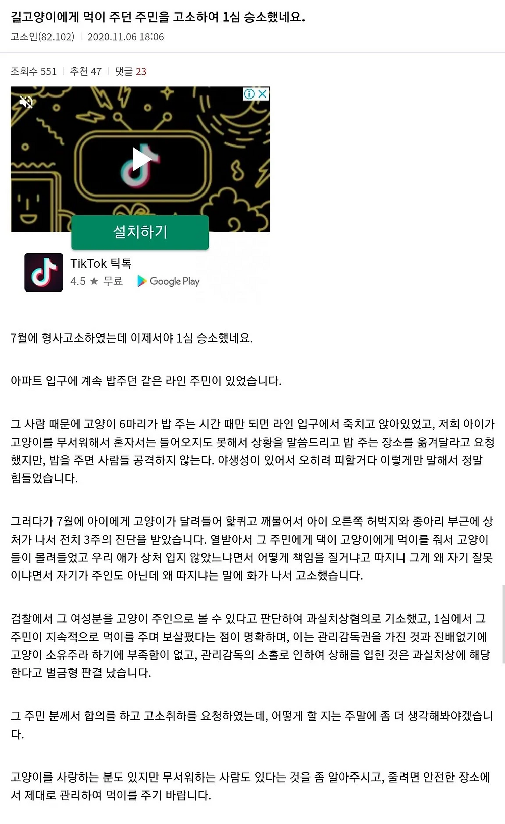 캣맘의 문제는 그거임. 자기 고양이도 아닌데 자기 새끼인거마냥 밥챙겨줌. 정작 그 고양이 때문에 사고나면 내 새끼 아님.
