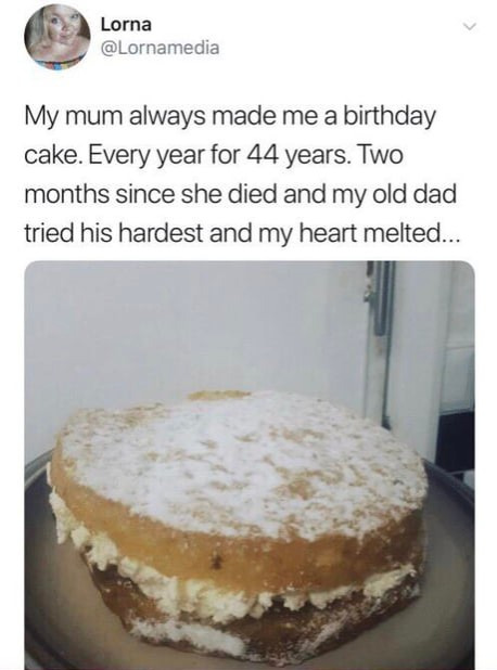 우리 어머니는 내 생일마다 항상 케이크를 만들어주셨다. 44년 동안 빠짐없이. 그런 어머니가 두달전에 돌아가셨다. 아버지는 최선을 다하셨고 내 가슴은 미어졌다.