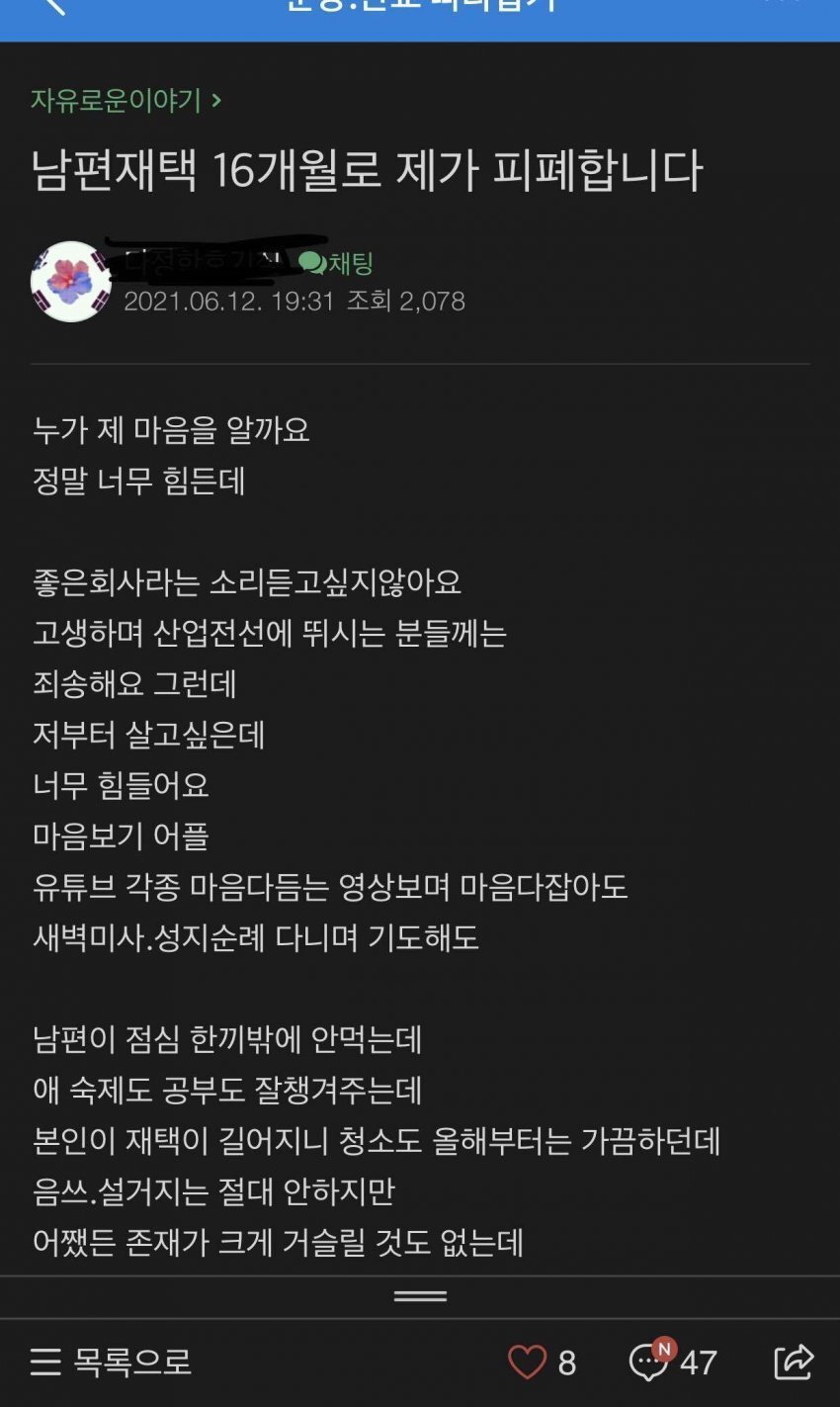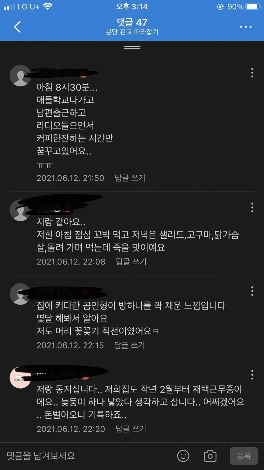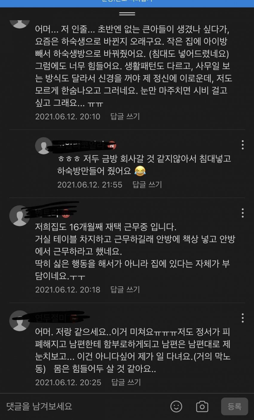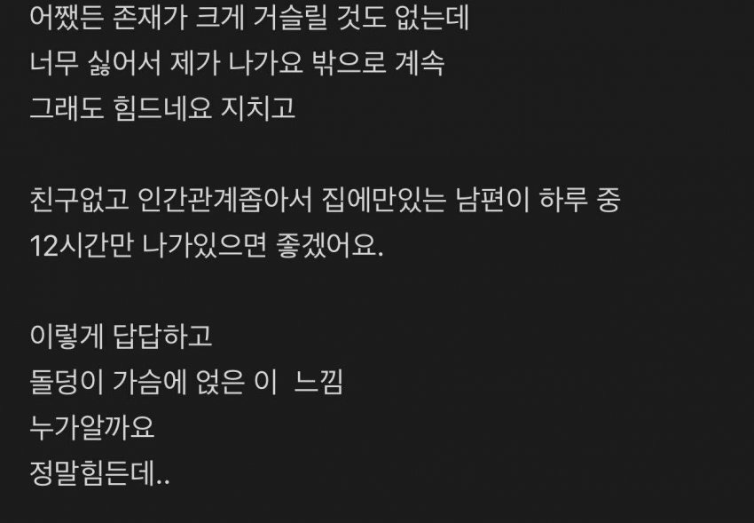 에효;;; 쓰레기 같고 병신같지만 저게 현실인걸 어떡하냐; 대부분 사람들이 나는 안그러겠지, 저런거는 일부 특이한 경우를 일반화 한거야 라고 생각하는데.... 대부분의 기혼 가정이 저런 현상을 겪고 있다. 나중에 좀 평화로워 지는거는 그냥 참고 사는법을 터득해서 임. 내 주변 친구+와이프 친구의 경우는 100% 한집도 예외없이 저런 딜레마를 겪음.