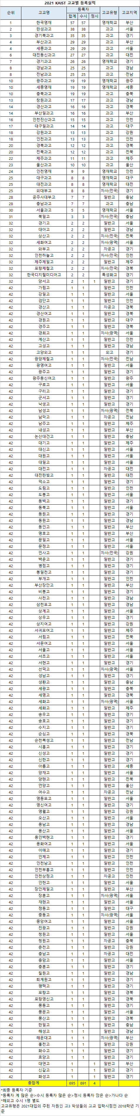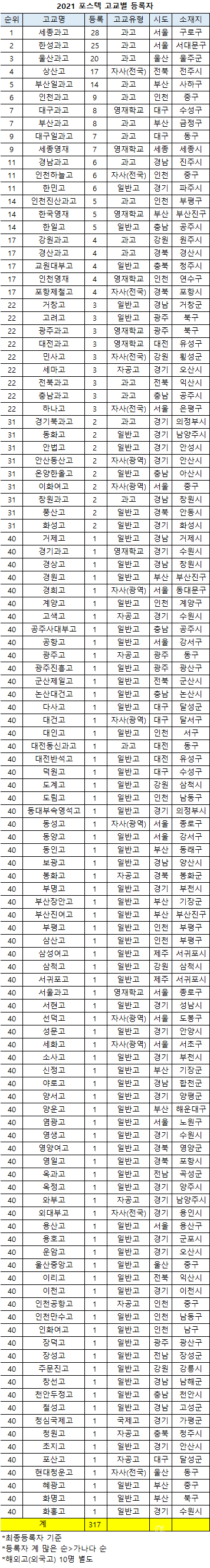 [유머] 2021 카이스트&포스텍 고교별 등록자 순위