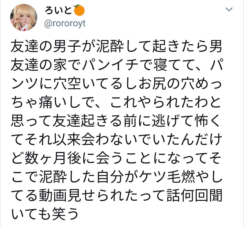 몇개월 후에 어쩌다 다시 보게되었는데, 그때서야 술에 취한 자신이 똥꼬털을 태우고있는 동영상을 보게되었다는 이야기 몇번을 들어도 웃기다