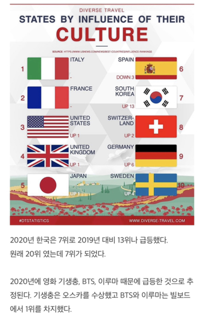 한류 뭐다해서 겨울연가 나오고 대장금 이런거 드라마 퍼질때도 저정도는 아녔을건데... BTS BLACK PINK 같은 아이돌이나, 작년말 올해 영화제에서 수상했던 영화들이 가져오는 파급력이 장난이 아니네... 일시적이지 않고 쭉 이어갔으면 좋겠네요.