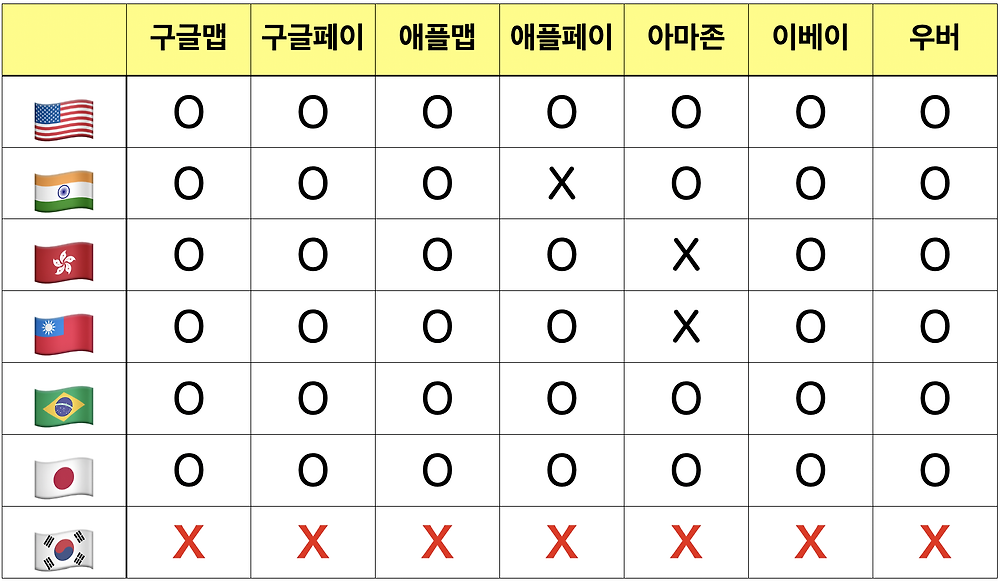 1. 구글맵이 안되는게 아니라 네이버나 다음에서 구글맵을 가져다가 어레인지 해서 서비스중 2. 삼성페이 미만 잡? 3. 네이버 다음 지도가 잘되있어서 애플맵이 필요가? 4. 카카오페이 선에서 나머지는 정리가 가능함 5. 아마존, 이베이 대체할 인터넷 쇼핑몰 차고 넘치니까.. 6. 우버는 안타깝게도 택시 업계한테 털려서 도입실패