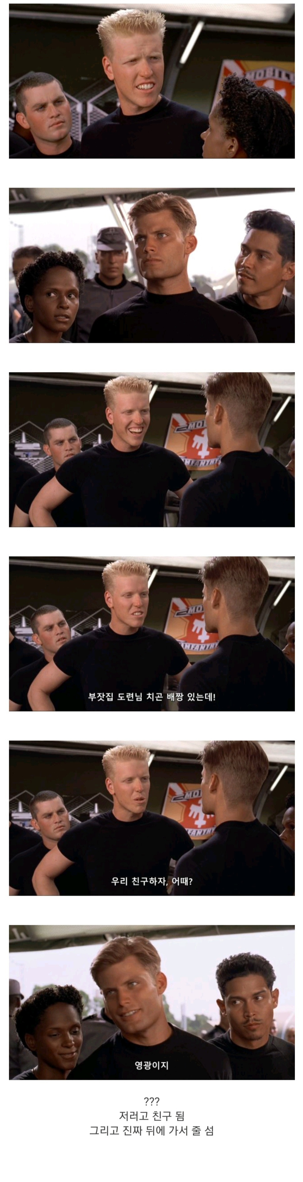 스타쉽 트루퍼스는 기억에 남는 장면이 너무 많음... 그중에 사격 훈련하다가 하이바 고장났다고 벗은 병사 머리 레이저 맞아 죽은게 제일 인상 깊었음... 저영화 처음 본게 초2 때라 더더욱..