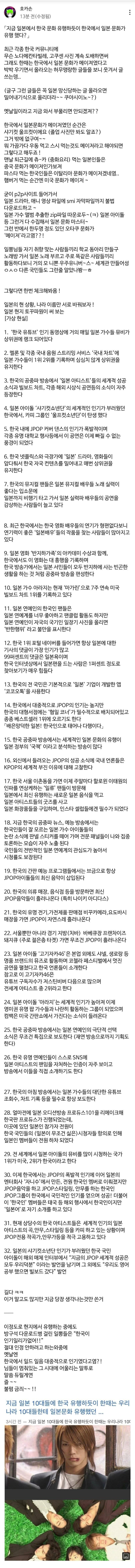 제목에는 문화라고해놓고 예시는 전부 연예계네. 한정된분야로 놓고보면 아직도 일본문화가 메이져인 부분이 있지. 방송연예쪽으로는 한국이 넘사지만.