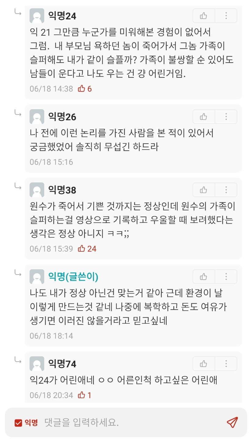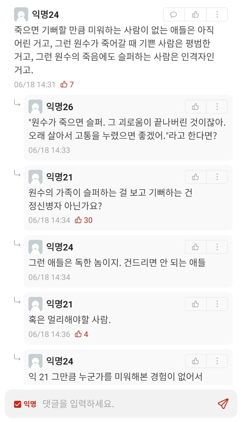 난 직장괴롭힘 당해본적은 없지만 기본적으로 싫어하는 사람 죽으면 기분 나쁘지 않더라고. 아는애 하나 자살했는데 이놈이 약간 싸이코라 사람마다 다 시비걸고 다니고 그랬음. 만만한 애한태는 술먹고 주먹질도 하고. 룸메이트가 딸딸이 치는데 들어왔다고 식칼들고 찌를라고 쫒아다녔던놈인데. 장례식장가서도 진심으로 슬퍼하는 애가 없더라