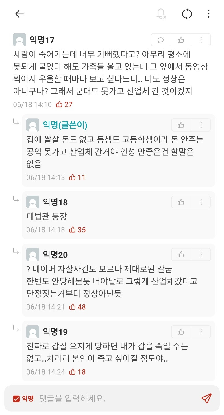인과응보 잘못한걸로 갈굼해야지 아무것도 아닌걸로 갈굼했으니 죽어도 머 ㅋ