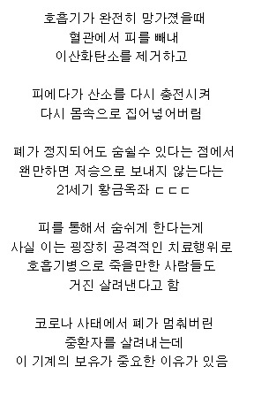 웃긴게 에크모 써서 환자가 죽으면 보험이 적용되고 환자가 살면 보험적용이 안됨 그래서 중환자실에 에크모 있어도 잘안씀. 아니 못씀