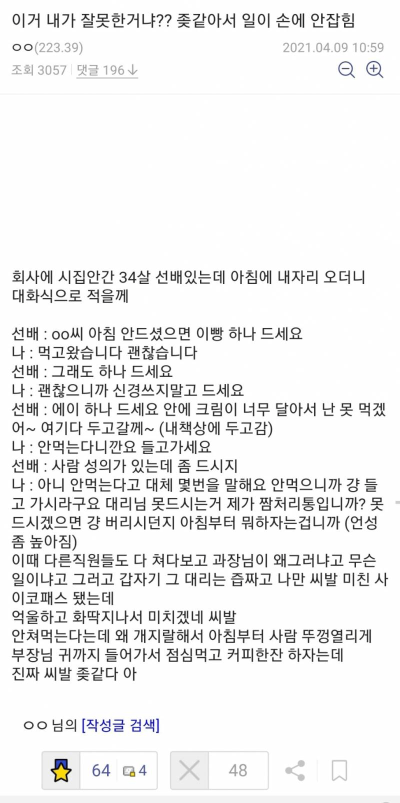 대리님 할정도면 좆밥 사원찌끄레긴데 어디 사무실안에서 언성을 높이놐ㅋㅋㅋㅋㅋㅋㅋㅋ 꼰대를 떠나서 그냥 사회 생활할 준비가 안된 새끼네
