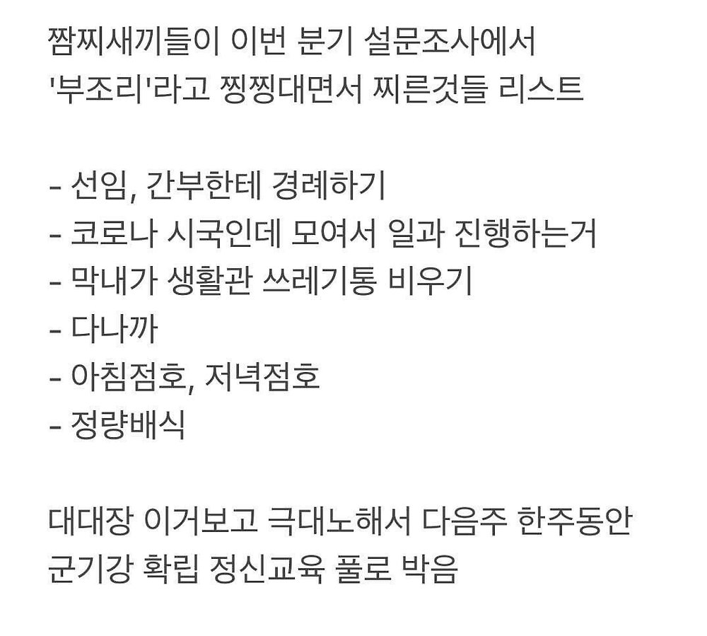 하아 암만 군인도 인권이 필요하니 부조리는 개선이 돼야하지만 저런걸 부조리랍시고... 그냥 저런애들은 하나씩 무인도 보내서 혼자생활하라해야할듯