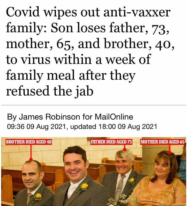 미국의 흔한 백신 접종을 거부한 가족이 가족 모임 후 7일 새 4명중 3명이 사망함. 혼자 살아남은 한명은 이제와서 코로나음모론자들 비난하고있는데 뭐 자기들 선택이었는걸 어쩔