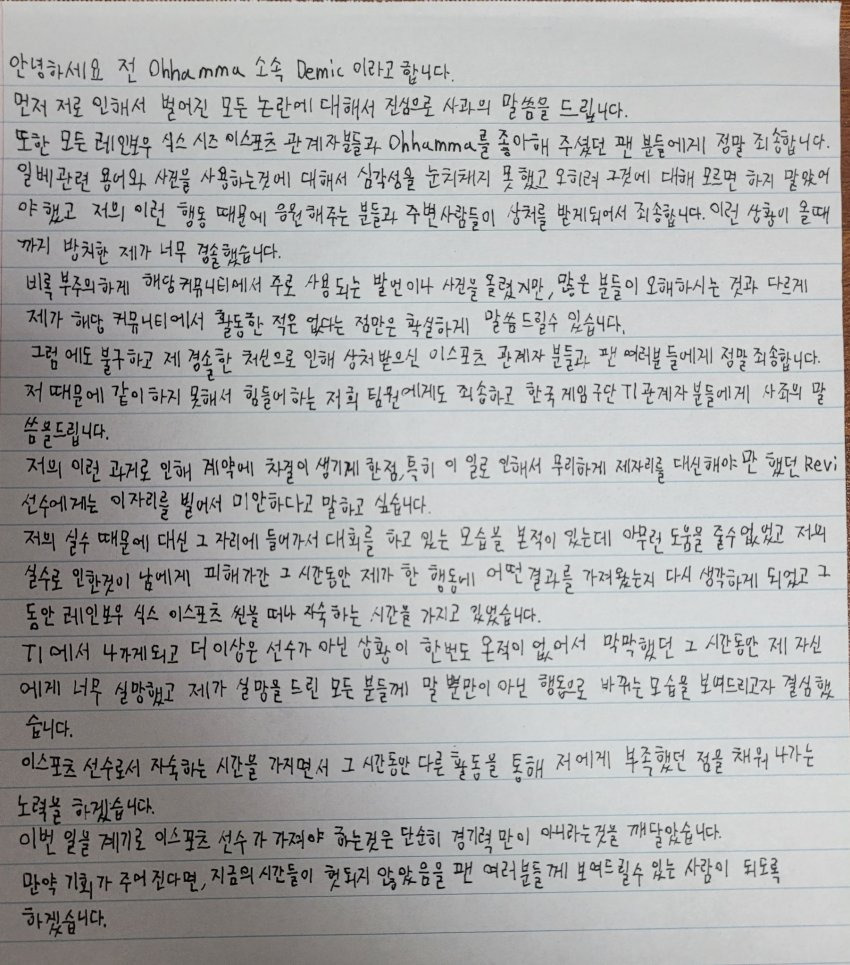 T1에서 레인보우식스 프로팀 만들었는데 선수 하나가 일베짤 공유하는걸 걸림. 계약한지 37시간 만에 짤리고 은퇴함.