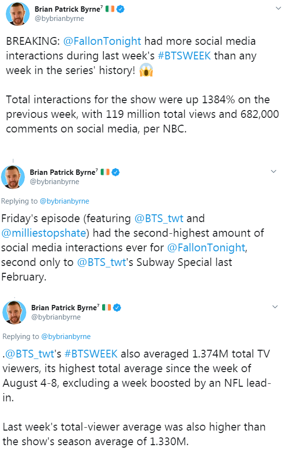 1. 지난 bts쇼는 지미팰론쇼 역사상 가장 높은 시청자수를 기록했다.