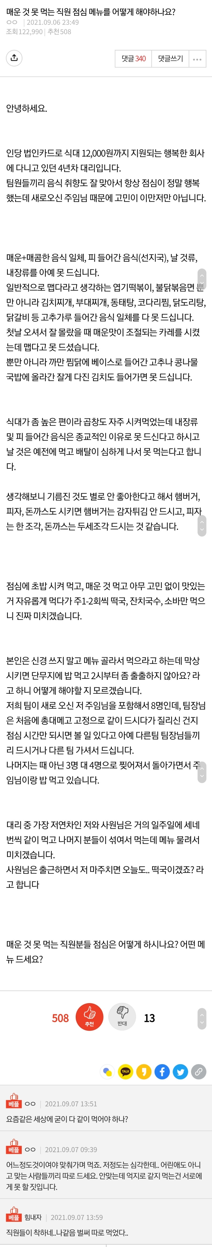 [유머] 판) 매운 것 못 먹는 직원 점심 메뉴를 어떻게 해야하나요?