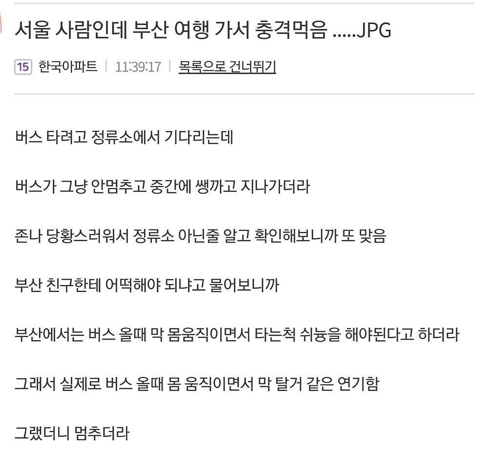 안양에서 광명가는 3번버스였나 심지어 나는 버스오길레 타려고 몸 움직이다가 가만 이버스가 맞나? 싶어서 잠시 시선을 버스 옆구리(노선도 적힌곳)에 뒀더니 버스가 멈추다가 다시 가속해서 지나가더라 씨발 버스에 치일뻔 저 글쓴놈은 경기도도 안나가본 서울촌놈인가봄