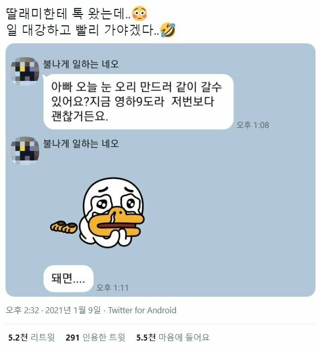 [유머] 눈 오는 날 딸래미한테 카톡 옴