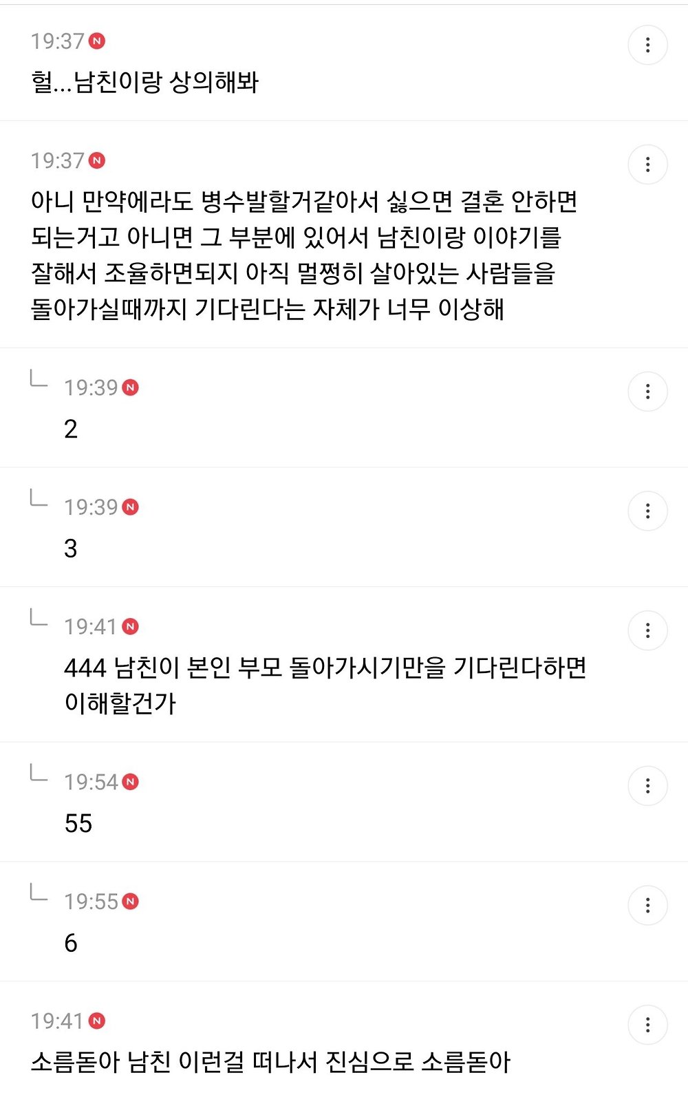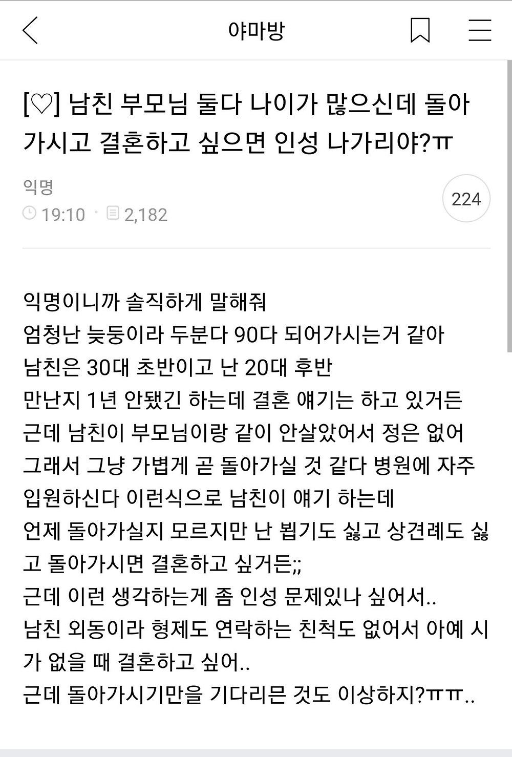 남친 배우자든 내가 사랑하는사람이 행복하길 바라는게 기본적일텐데 남친이 부모님이 돌아가시는게 행복하다고 생각하고 그리 생각하는대도 만나는거면 끼리끼리니 별 상관이 없다만 그건 아닐거 아녀 에시당초 관계가 나빳으면 살아있나 죽어있나 왕래 자체를 안할거니 아예 언급자체가 안됫을거고 즉 여자는 남친이 아닌 본인만 생각하는건데 이기적이라고 본다...