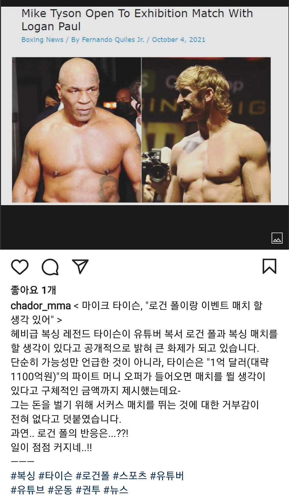[유머] 마이크 타이슨. 유투버 로건폴에게 복싱매치 제안