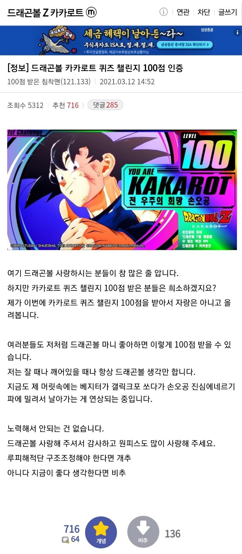[유머] 침착맨 카카로트갤 100점 인증