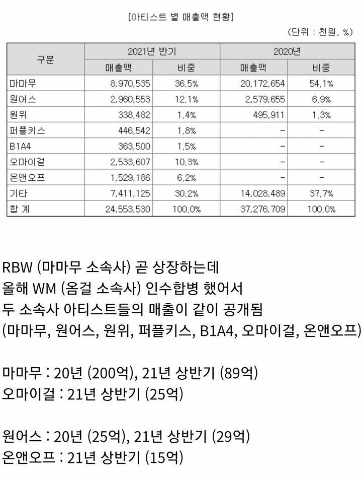[유머] 소속사 합병때문에 마마무, 오마이걸 등 아티스트별 매출 공개됨