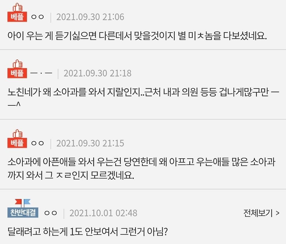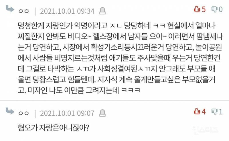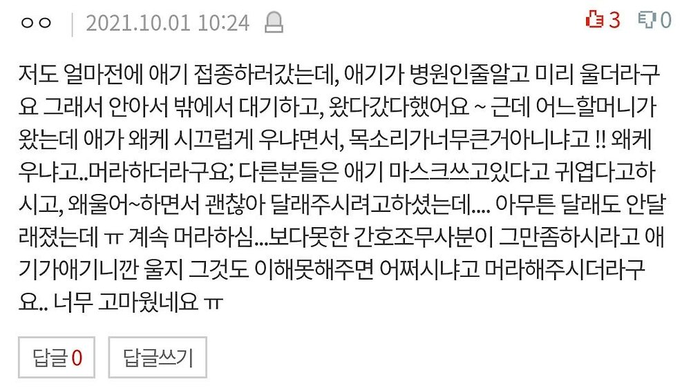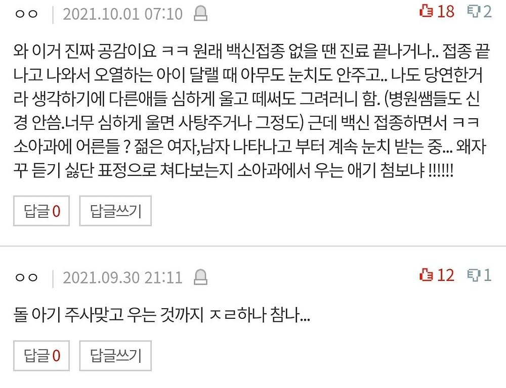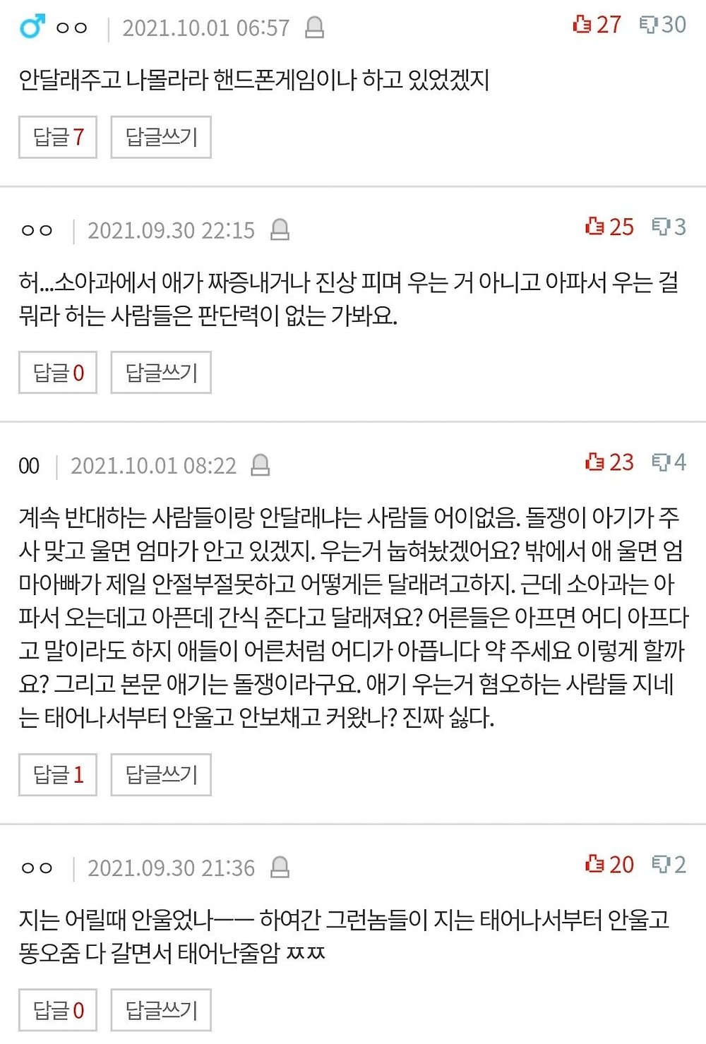 그거랑은 완전 다른문제임. 저건 4살 5살 이상의 애들이 지하철 식당등 공공장소에서 난리피우는데 방관하는 부모들에게 하는말이고 겨우 태어난지 1년 남짓된 돌쟁이 애가 주사 맞고 우는걸 그 부모들이 어떻게해줌. 그렇다고 애들한테 예방접종을 안해야하는것도아니고. 저거는 그냥 당연히 울 수밖에 없는 상황이고 소아과에서 와서 저런 소리하는 어른이 철딱서니없고 지 밖에 모르는 사람인거임