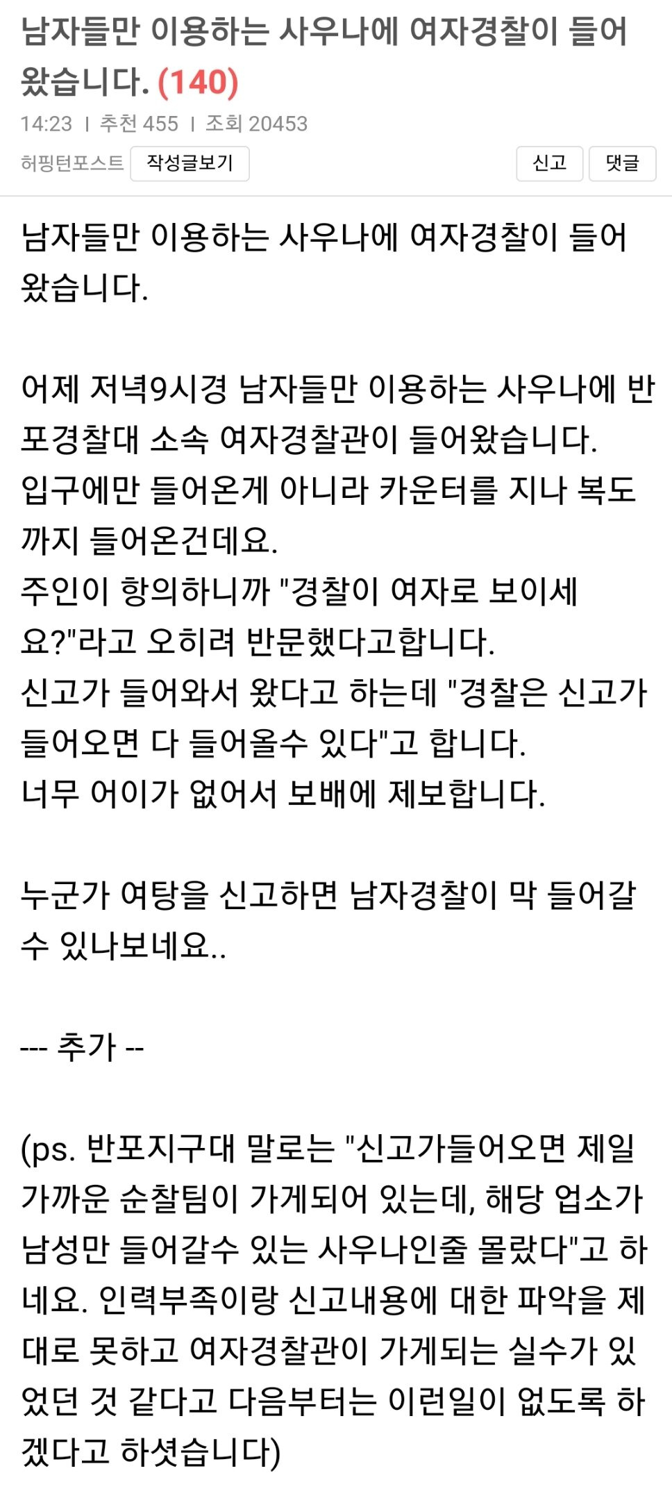 [유머] 남자들만 이용하는 사우나에 여자경찰이 들어왔습니다