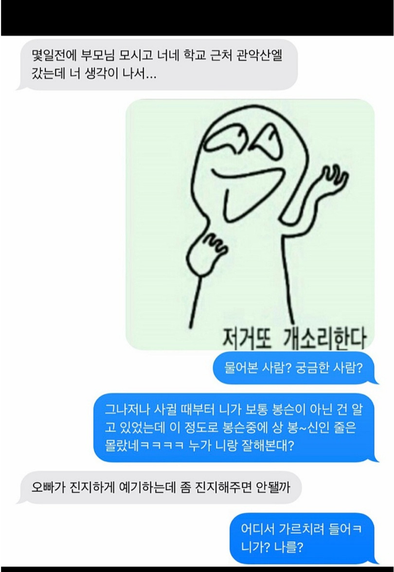 주작냄새 존나나네요. 지금 다시 가서보면 저 댓글이랑 작성자랑 같은사람일듯 너네 학교 근처 관악산? 관악산?ㅋㅋㅋㅋㅋ 보통 그냥 너네학교근처라 하지, 굳이 굳이 관악산? 내가 서울대생이다라고 말하고 싶은거같은데 시발 여초주작 역겹쥬?