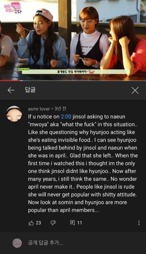 “2분쯤 보면 진솔이 나은한테 (현주) 왜 안 보이는 거 먹냐는 식으로 ‘뭐야’ 함. 현주가 에이프릴 활동할 때 진솔과 나은한테 밀렸던 게 보여. 난 현주가 팀을 떠나서 기뻐. 나 이거 첨 봤을 때 나만 진솔이 현주 싫어하는 것 같았는데...몇년 지난 지금도 여전히 그렇게 생각함ㅇㅇ에이프릴 잘 못 나가는 거 당연해. 진솔 같은 애는 저딴 무례한 태도로 절대 인기 못 끌어.”