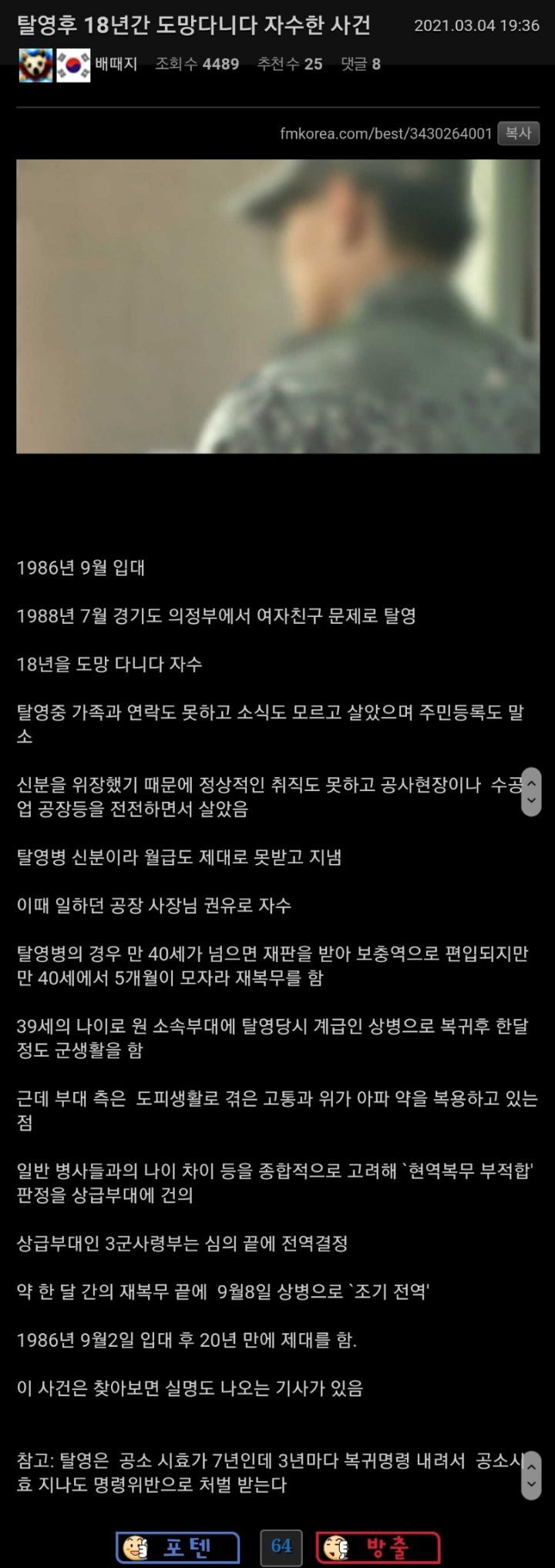 [유머] 탈영후 18년간 도망다니다 자수한 사건