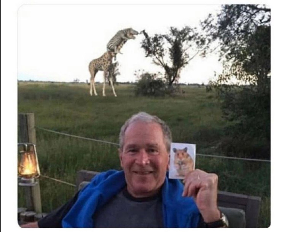 [유머] 햄스터 사진 든 부시 대통령 뒤에서 기린 목마 타고 풀 뜯는 얼룩말