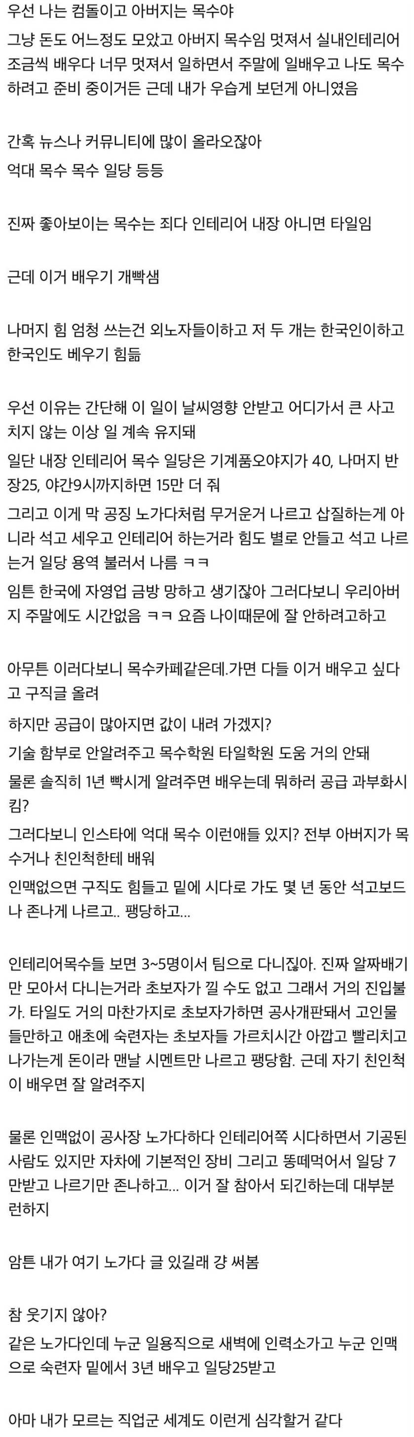 오야 목수 최소 50, 비싼아재들은 60줘야되는데 언제적 얘길하냐