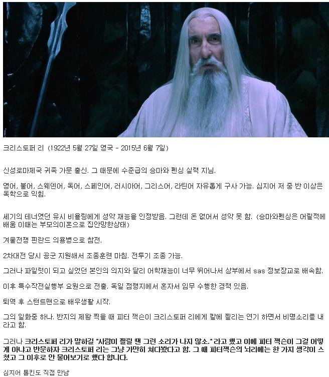 피터 잭슨이 '등에 칼을 찔리고 비명을 지르는 연기를 해달라' 부탁했는데, 등에 칼이 박히면 비명도 못지른다고 반문한 크리스토퍼 리 경. 직접 전쟁을 겪어본 세대의 기억에 새긴 조언...