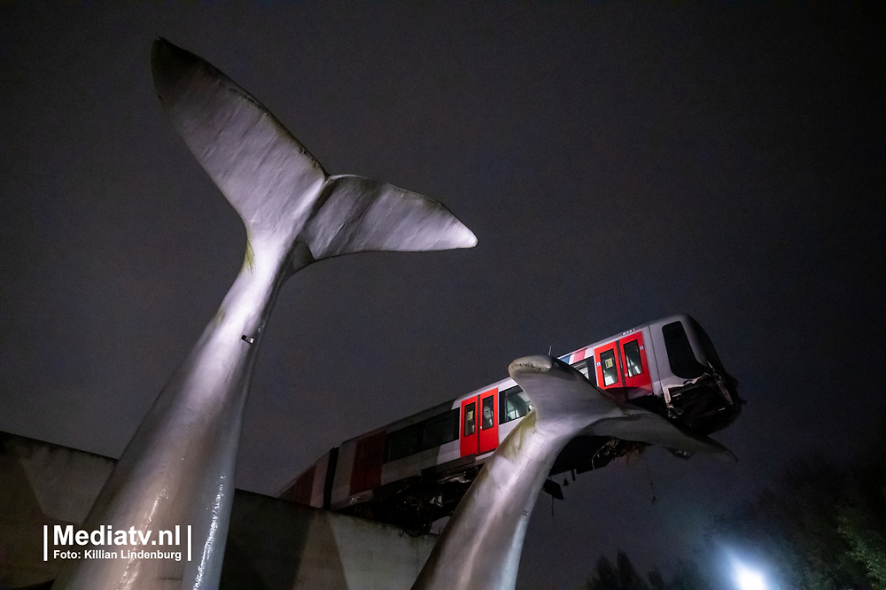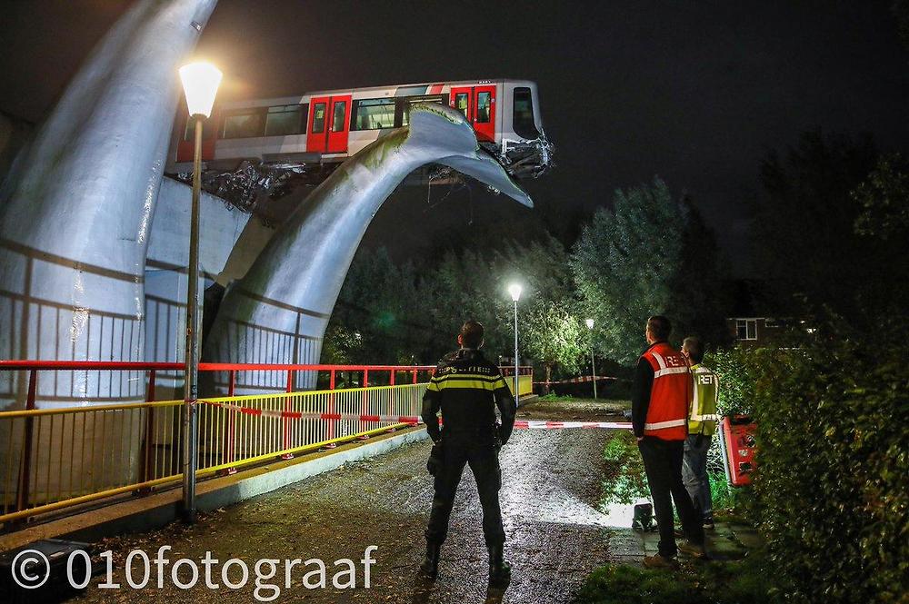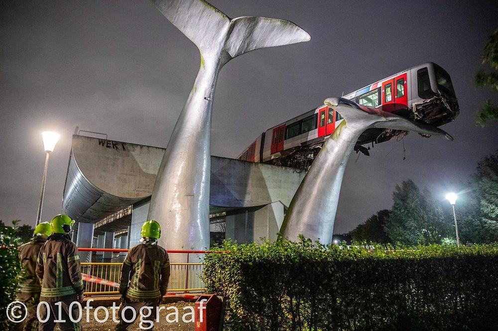 전철 한칸이 제동미스로 벽을 넘었는데 조형물에 걸려 살아남음