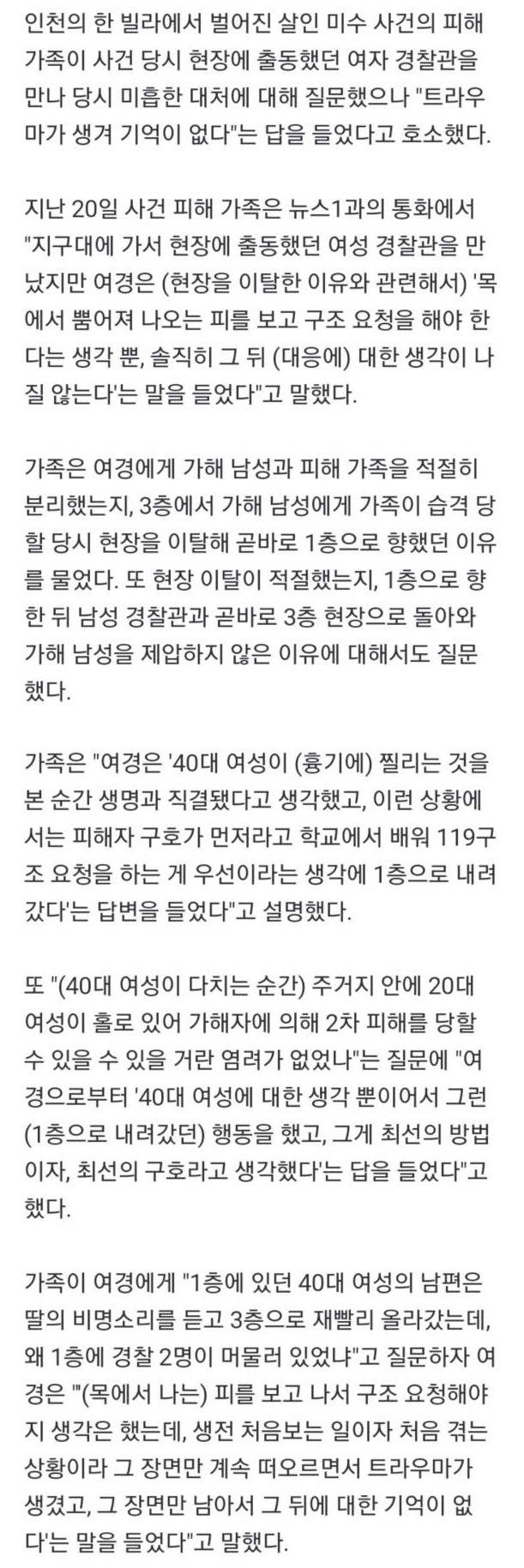 진짜 트라우마 생길 사람은 사람이 찔리는걸 눈앞에서 보고 찌른 사람하고 둘이 남은 상황이 된 20대 여성인데 말야.