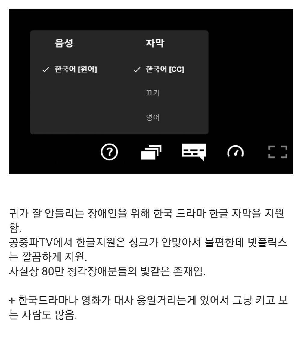 나도 한국드라마 뭐라는지 잘 안들려서 자막켜고 보는데 cc없는 버전도 있었음 좋겠음