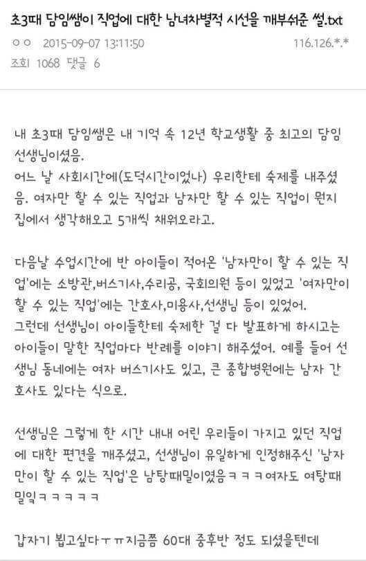 [유머] 남녀차별적 시선을 부숴준 참 선생님