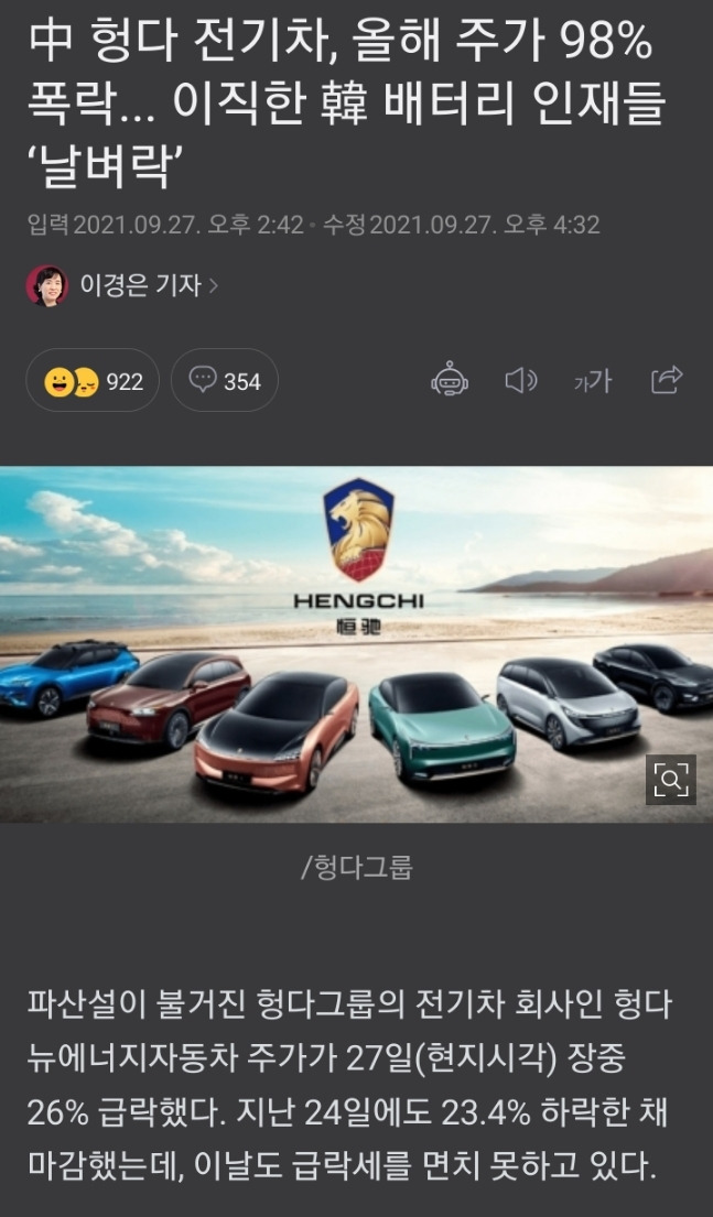 [유머] 헝다 전기차 이직한 한국 배터리 인재들