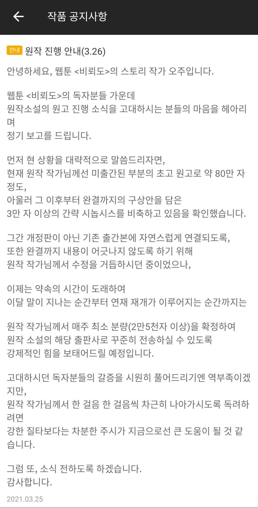 이게 2021년 3월 25일 게시물인데 현재까지 비뢰도(소설)의 마지막 업로드는 2013년 11월 10일에 멈춰 있는데 구라도 적당히