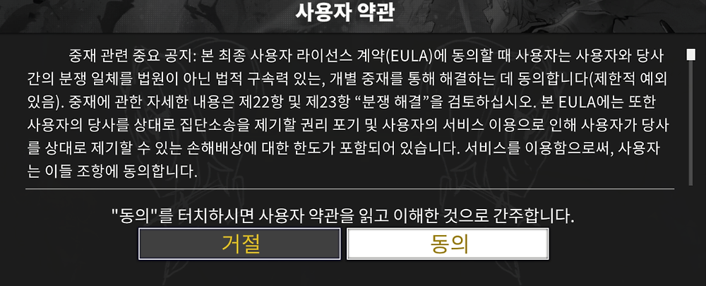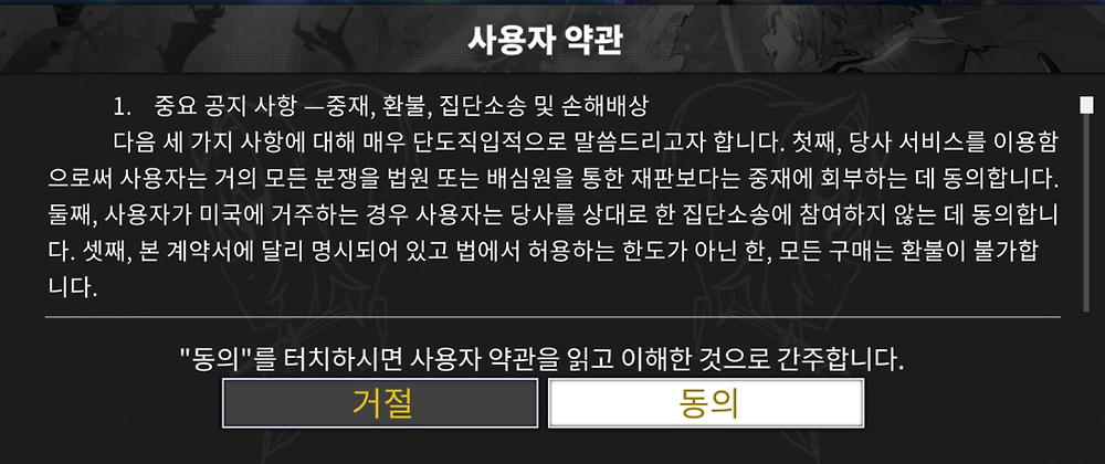 소송 권리 포기해라. (국가별 소송 관련 약관 별첨 되어 있음)