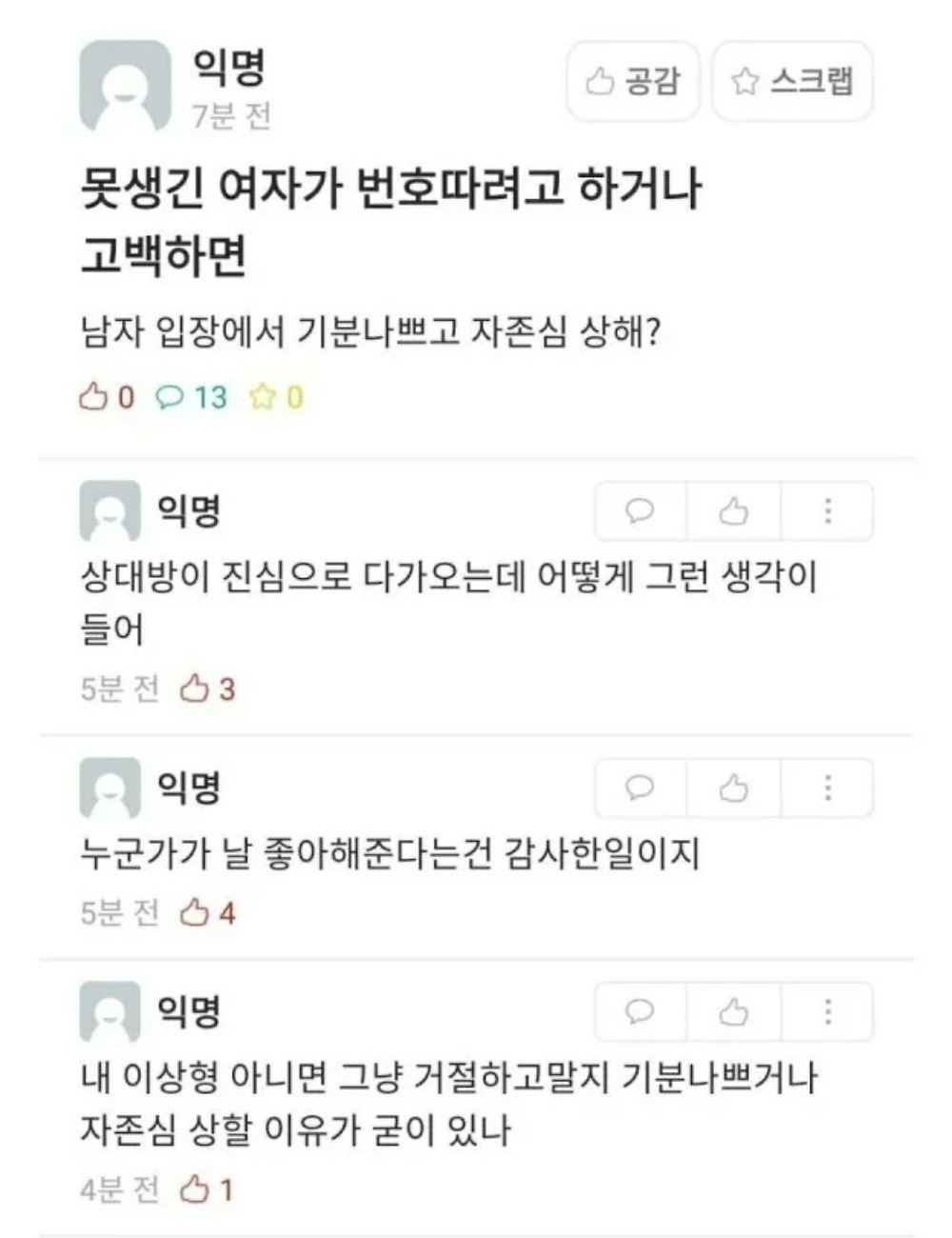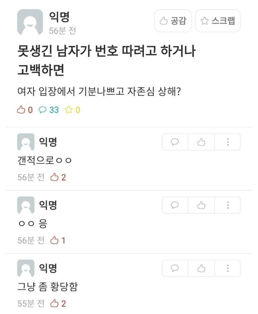 여자는 자신을 상품으로 여기니깐 못생긴애가 고백하면 상품성이 떨어진다고 생각하는거지
