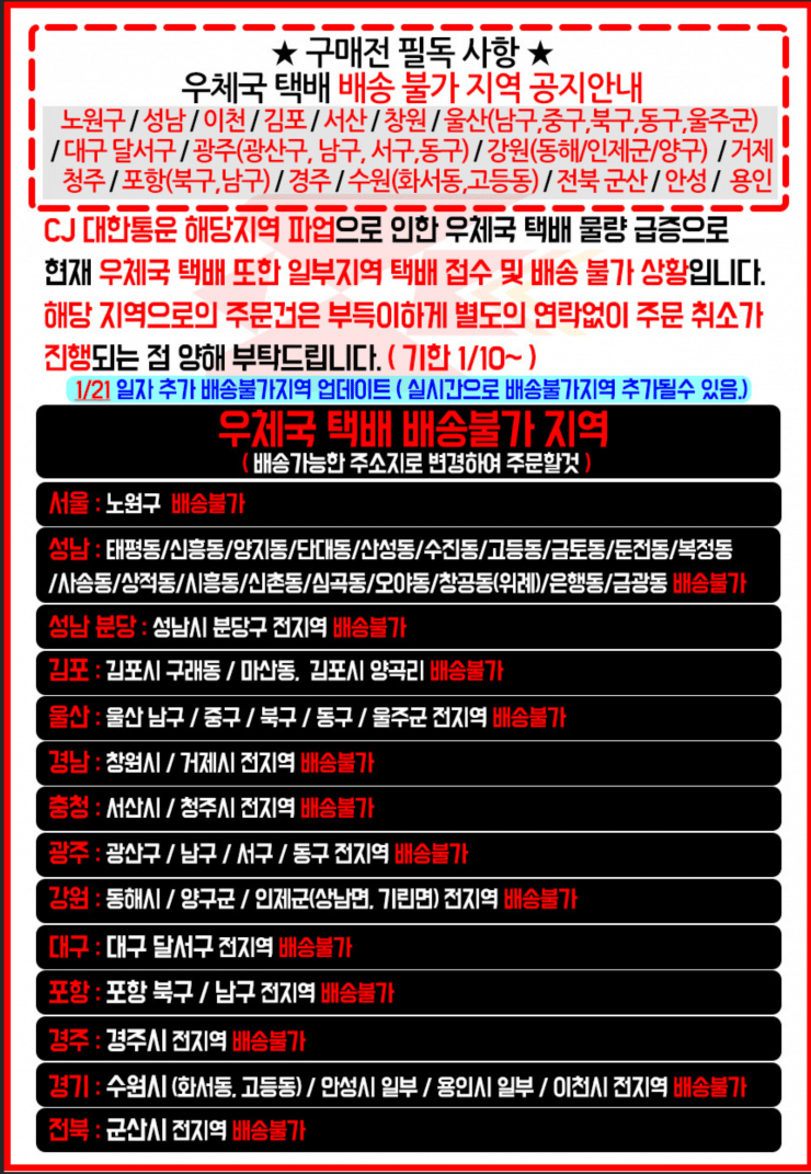 [유머] CJ 대한통운 파업으로 인한 우체국 택배 배송불가지역