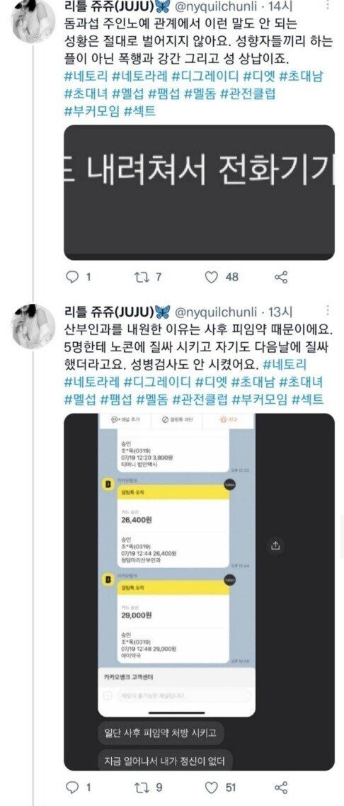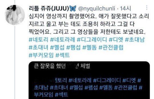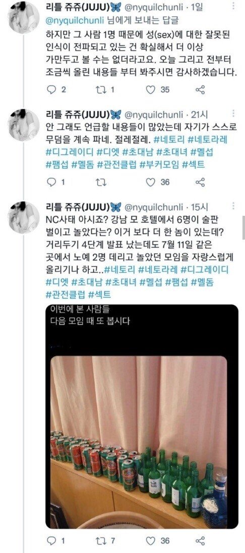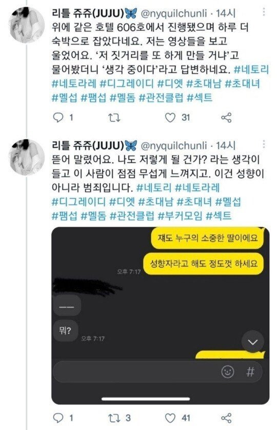 4. 성향자 여성중 한명인 "리틀 쥬쥬"가, 성행위 과정이 합의된 과정이 아니라, 강제적인 것이라고 주장하며, 해당 동영상을 모자이크해 게시함.