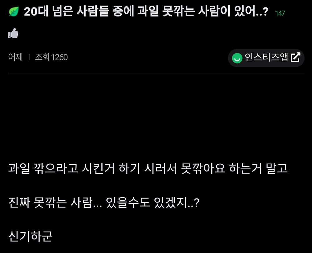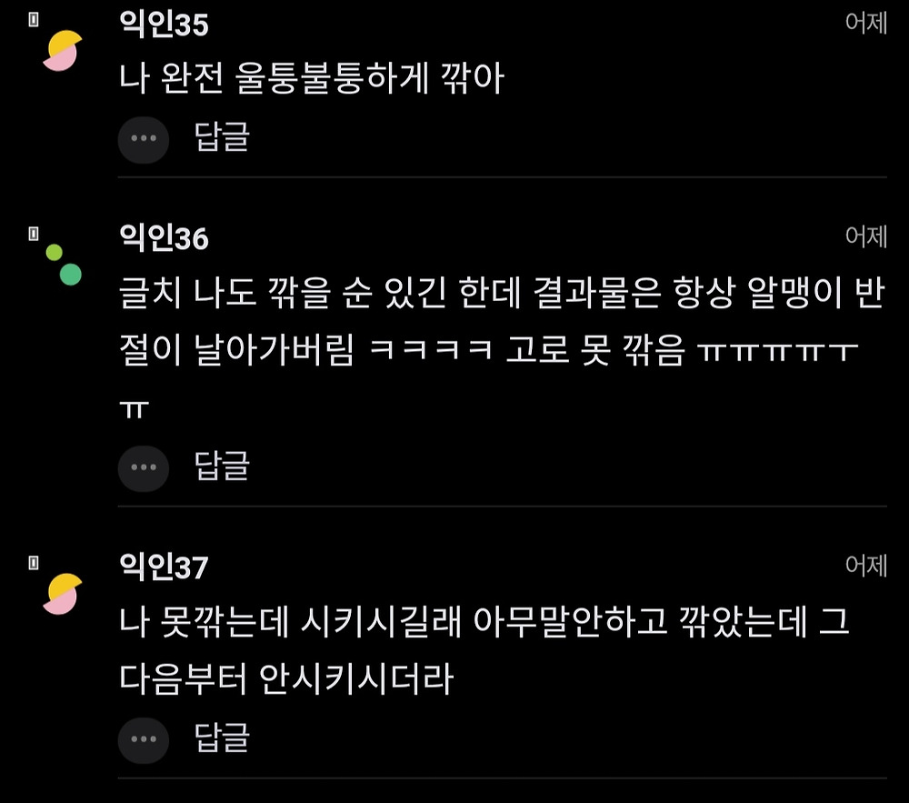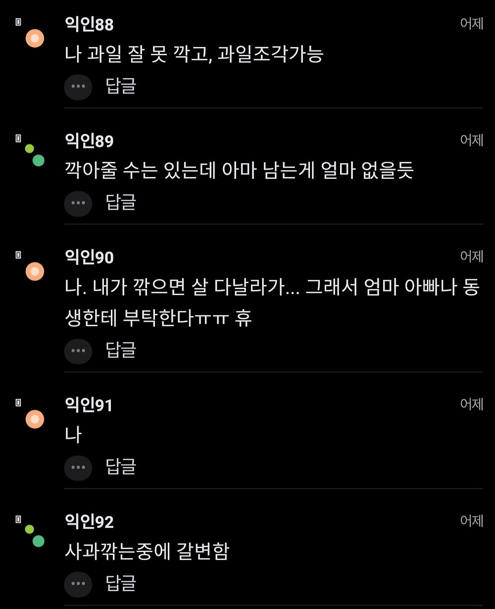울퉁불퉁하게 깎는걸 깎아주니까 고마운 마음이라도 들지. 난 자라면서 과일 깎아본 적이 없어서 못 깎아 하는 사람은 손절해야함. 고기집가면 고기 구워본 적 없다고 먹기만함 근데 계산을 지가하면 모시고 살아.